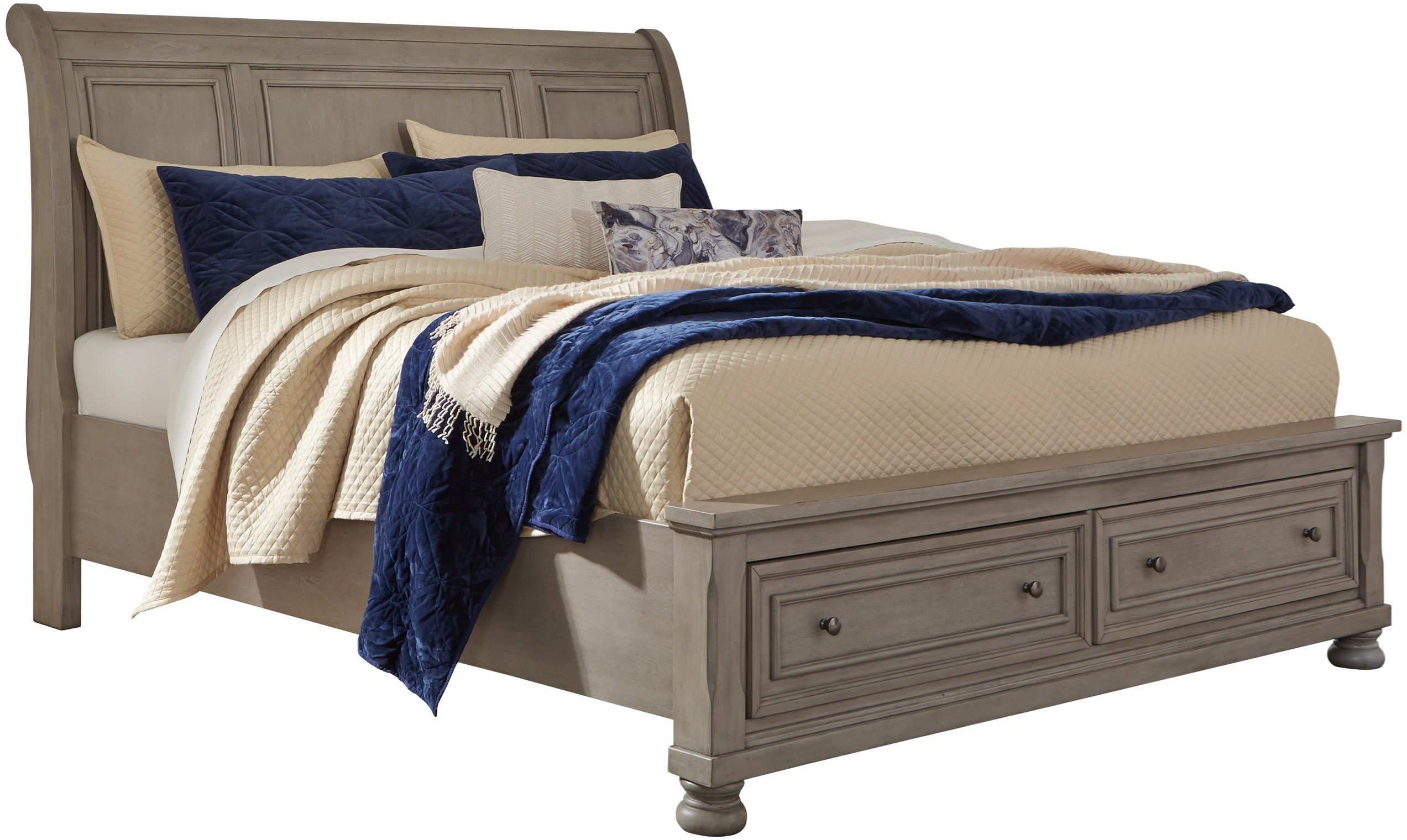 Satisfying your taste for tradition, this king sleigh bed with storage sports serene sophistication. Forever classic design details inlaid panels, silvertone patina hardware and bun feet are so easy to love. Burnished light gray finish elevates the look with modern sensibility.Read More