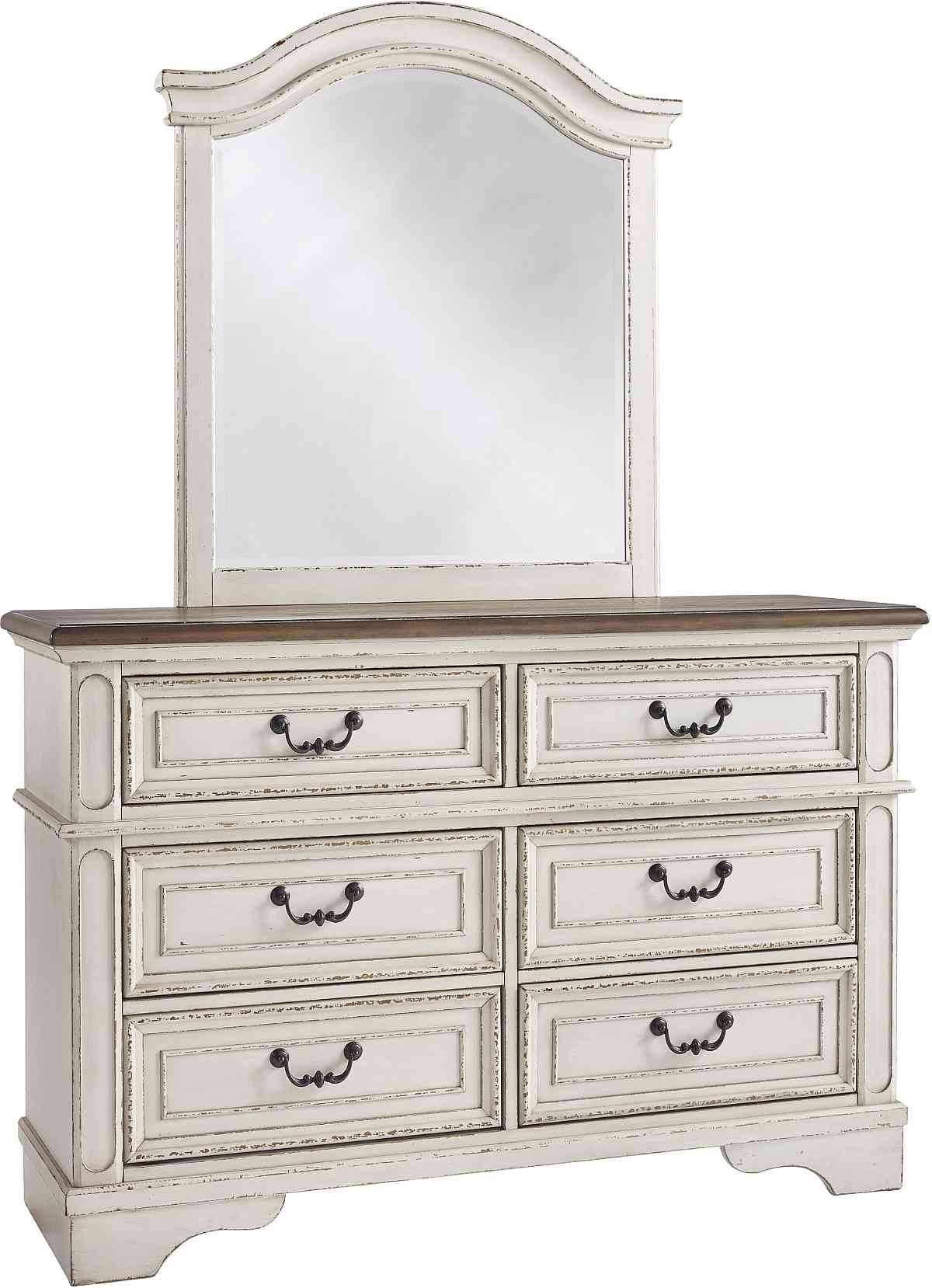 Elevating the art of traditional cottage styling, this dresser and mirror is her dream bedroom retreat realized. Antiqued two-tone aesthetic blends a chipped white with a distressed wood finished top for added charm. Assembly required for this product.Read More